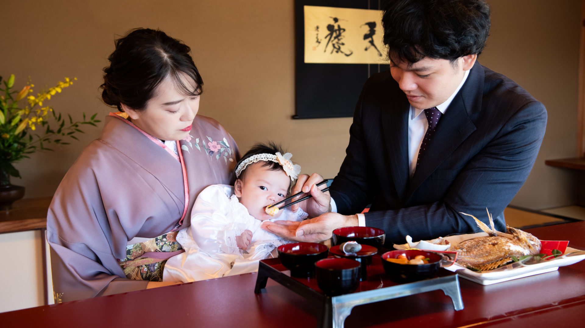 お宮参り・お食い初めは赤ちゃんのロケーションフォトデビューにぴったり!衣装レンタル、お支度、撮影までサポートします。初めてで準備が不安な方も安心してご利用ください。